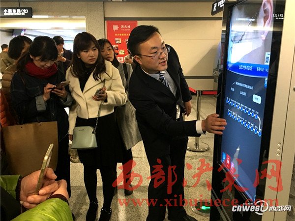 在小寨站站廳層,西安地鐵工作人員向市民介紹“乘客信息系統(tǒng)查詢(xún)系統(tǒng)”。