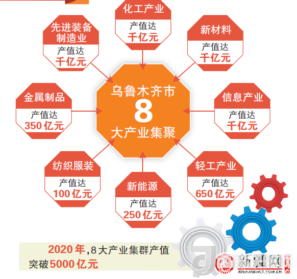 根據(jù)《關(guān)于加快烏魯木齊市工業(yè)重點產(chǎn)業(yè)集群發(fā)展的意見》,烏市將加快發(fā)展化工、先進裝備、新材料、新能源、信息、輕工業(yè)、金屬制品、紡織服裝八大產(chǎn)業(yè)集群及產(chǎn)業(yè)集聚區(qū)。到2020年,八大產(chǎn)業(yè)集群產(chǎn)值突破5000億元。其中,化工產(chǎn)業(yè)產(chǎn)值達到“千億”規(guī)模、先進裝備制造產(chǎn)業(yè)產(chǎn)值達到“千億”規(guī)模、硅鋁基電子新材料和高分子膜材料產(chǎn)業(yè)產(chǎn)值達到“千億”規(guī)模、新能源產(chǎn)業(yè)達到250億元規(guī)模、信息產(chǎn)業(yè)產(chǎn)值達到“千億”規(guī)模、輕工產(chǎn)業(yè)達到650億元規(guī)模、金屬制品達到350億元規(guī)模、紡織服裝產(chǎn)業(yè)達到100億元規(guī)模。