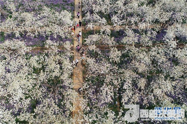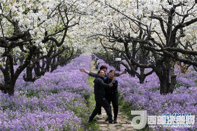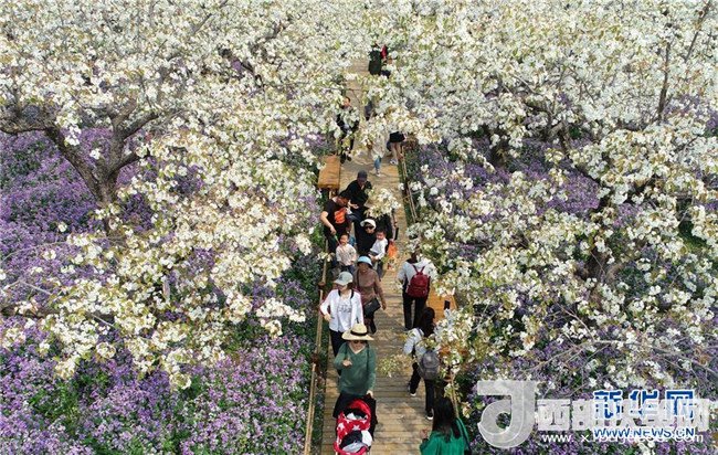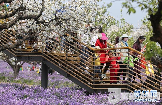 清明時節(jié),在江蘇省宿遷市三臺山森林公園梨香滿園景區(qū),白色的梨花和紫色的二月蘭爭相綻放,吸引眾多游客前來踏青賞花。 新華社發(fā)(周國強(qiáng) 攝)