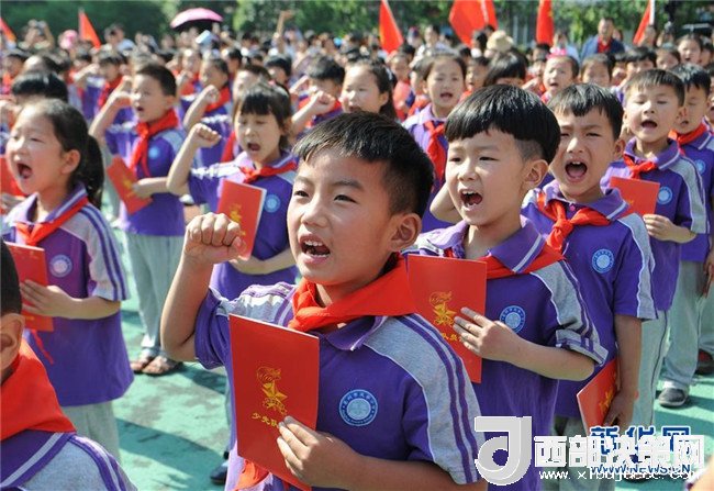 在2017年5月26日安徽省亳州市譙城區(qū)風(fēng)華小學(xué)舉行的入隊儀式上,孩子們在宣讀入隊誓詞。新華社發(fā)(張延林 攝)