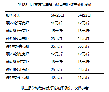 水產(chǎn)養(yǎng)殖網(wǎng)今早上傳的5月23日北京京深海鮮市場(chǎng)紅殼蝦青殼蝦批發(fā)價(jià)顯示,個(gè)頭最?。?-4錢(qián)/只)、最便宜的小龍蝦批發(fā)價(jià)僅需11元/斤,比昨天又降了1元。而湖南、江蘇、廣東等地的價(jià)格也和北京差不多,武漢甚至低至9元/斤。