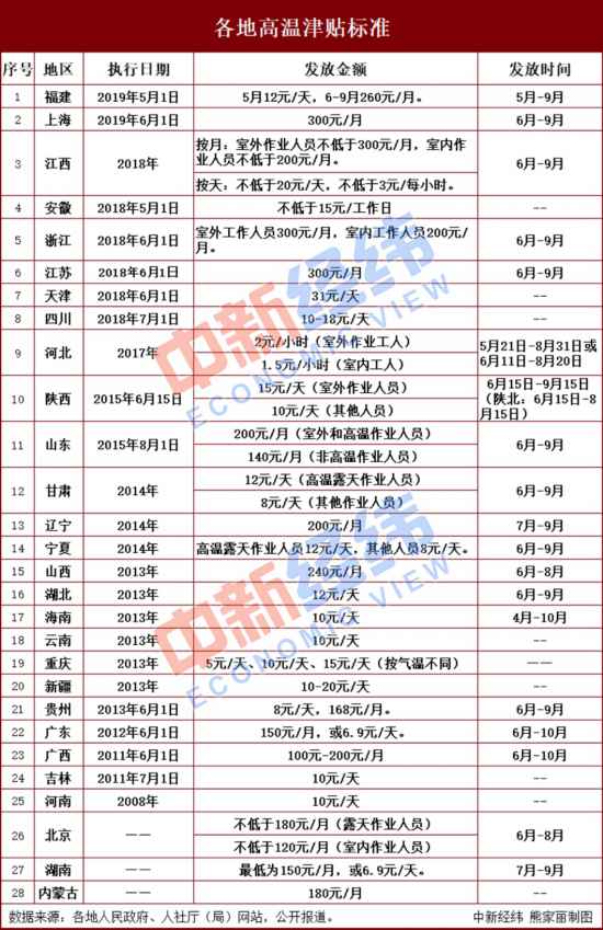 此外,2012年施行的《防暑降溫措施管理辦法》中明確規(guī)定,高溫津貼標(biāo)準(zhǔn)由省級(jí)人力資源社會(huì)保障行政部門會(huì)同有關(guān)部門制定,并根據(jù)社會(huì)經(jīng)濟(jì)發(fā)展?fàn)顩r適時(shí)調(diào)整。中新經(jīng)緯客戶端梳理目前各地高溫津貼實(shí)施辦法發(fā)現(xiàn),部分省份的高溫津貼標(biāo)準(zhǔn)長(zhǎng)達(dá)10年未曾改變。