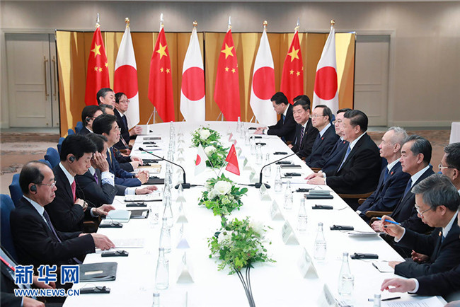 習(xí)近平強(qiáng)調(diào),雙方要始終恪守中日四個政治文件確立的各項原則,踐行中日“互為合作伙伴、互不構(gòu)成威脅”的政治共識,增進(jìn)互信,推動中日關(guān)系始終沿著和平、友好、合作的正確軌道持續(xù)向前發(fā)展。要深化經(jīng)貿(mào)、投資、第三方市場、科技創(chuàng)新等廣泛領(lǐng)域合作,打造新的合作增長點(diǎn),積極引領(lǐng)區(qū)域經(jīng)濟(jì)一體化。我們歡迎日本企業(yè)積極擴(kuò)大對華合作,分享中國發(fā)展新機(jī)遇。共建“一帶一路”倡議為中日互利合作開辟了廣闊天地,歡迎日方積極參與。雙方要拉緊人文紐帶,加強(qiáng)兩國青少年交流,促進(jìn)兩國民眾相知相親。我贊同年內(nèi)啟動中日高級別人文交流磋商機(jī)制。要通過對話協(xié)商建設(shè)性管控矛盾分歧,加強(qiáng)外交和安全領(lǐng)域?qū)υ?,?gòu)建建設(shè)性雙邊安全關(guān)系。希望日方恪守迄今共識和承諾,妥善處理好歷史等敏感問題,共同維護(hù)東海和平穩(wěn)定。中日應(yīng)該加強(qiáng)在國際和地區(qū)事務(wù)中的溝通、協(xié)調(diào)、合作,共同應(yīng)對全球性挑戰(zhàn),推動全球治理更加公正合理。中方支持日方辦好二十國集團(tuán)領(lǐng)導(dǎo)人大阪峰會,期待峰會發(fā)出維護(hù)多邊主義和自由貿(mào)易的明確聲音,為世界經(jīng)濟(jì)發(fā)展注入穩(wěn)定預(yù)期和動力。
