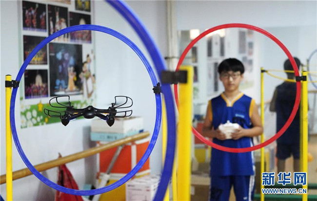 7月30日,學(xué)生在河北省涉縣青少年活動中心進行航模飛行練習(xí)。