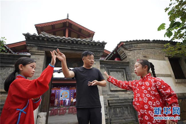 8月20日,河北省秦皇島市北戴河“裴艷玲藝術(shù)傳承基地”的老師在培訓(xùn)孩子們表演京劇。