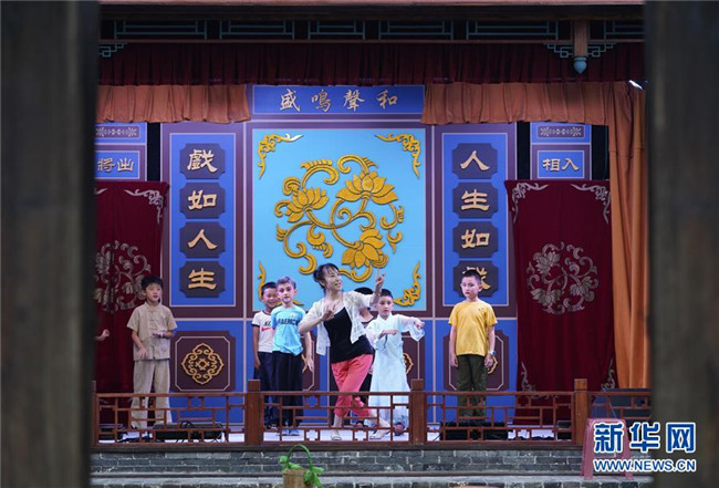 8月20日,孩子們在河北省秦皇島市北戴河“裴艷玲藝術(shù)傳承基地”學(xué)習(xí)表演京劇。