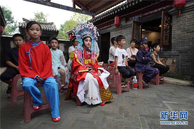 8月20日,孩子們在河北省秦皇島市北戴河“裴艷玲藝術(shù)傳承基地”觀看京劇表演。