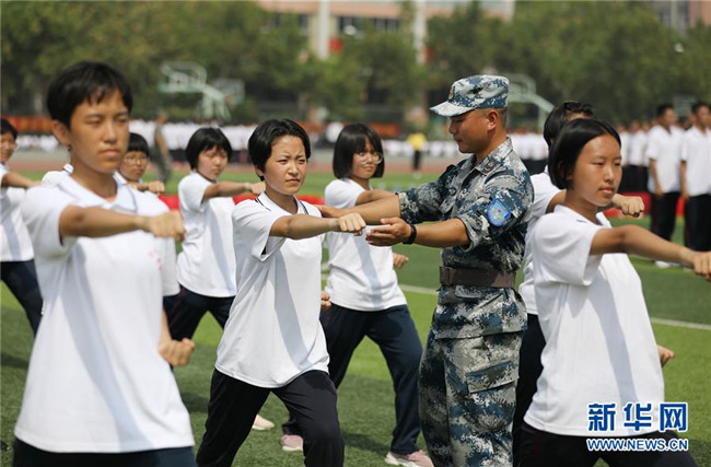 8月27日,河北省衡水市第二中學(xué)高一新生在教官指導(dǎo)下進行軍訓(xùn)。