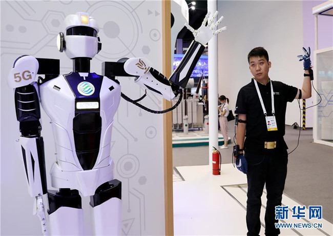 一名工作人員(右)在上海舉行的2019世界人工智能大會上演示一款基于5G網絡實現遠程控制的機器人(8月29日攝)。新華社記者 方喆攝