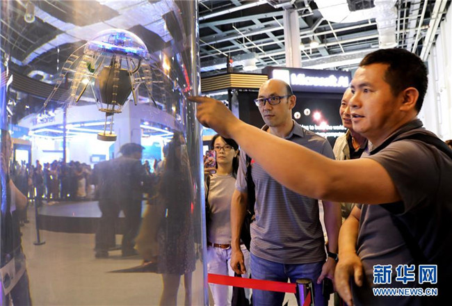參觀者在上海舉行的2019世界人工智能大會上與一個智能機器人進行交流(8月29日攝)。新華社記者 方喆攝