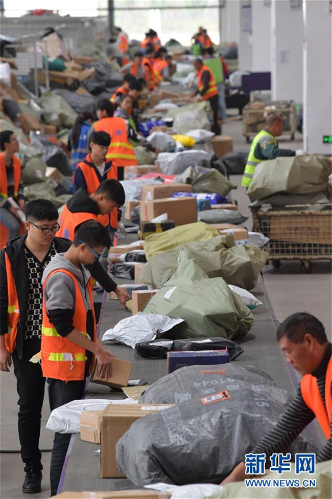在圓通速遞公司南昌轉(zhuǎn)運(yùn)中心,工作人員正在流水線上分揀快遞包裹(2018年11月14日攝)。新華社記者 彭昭之 攝