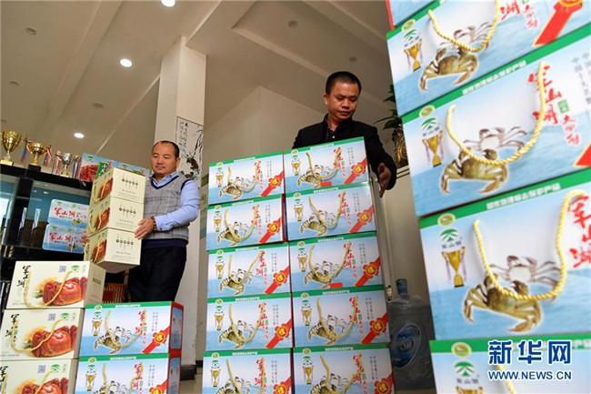 在江西省進(jìn)賢縣軍山湖大閘蟹線上銷售網(wǎng)點(diǎn),工作人員準(zhǔn)備將裝箱的大閘蟹發(fā)貨給網(wǎng)購的顧客(2018年11月9日攝)。新華社記者 彭昭之 攝