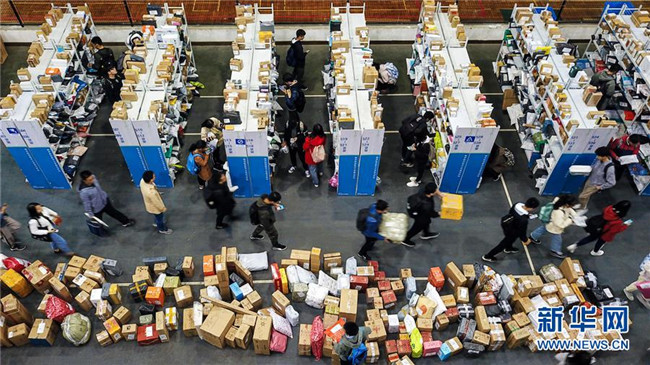 南京航空航天大學(xué)師生在校園臨時(shí)快遞取件點(diǎn)領(lǐng)取快遞(2018年11月13日攝)。為應(yīng)對(duì)“雙十一”大量校園快遞包裹,南京航空航天大學(xué)在原“快遞超市”的基礎(chǔ)上,將學(xué)校體育中心室內(nèi)網(wǎng)球場搭建為臨時(shí)快遞取件點(diǎn),方便在校師生取件。新華社記者 李博 攝