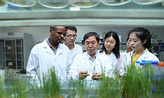 西北農(nóng)林科技大學(xué)旱區(qū)作物逆境生物學(xué)國家重點實驗室小麥-條銹菌互作室里,“小麥癌癥”攻克者康振生院士正指導(dǎo)學(xué)生觀察酵母菌落培養(yǎng)情況。張勁松攝