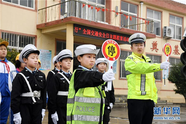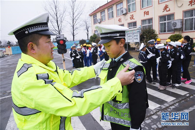 12月1日,東皋埠小學(xué)“小小交警隊”隊員們在安全教育活動中整理“警容”。新華社記者 李紫恒攝