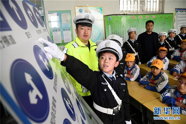 12月1日,東皋埠小學(xué)“小小交警隊”王嘉瑞(前)在為同學(xué)們介紹交通標(biāo)識。新華社記者 李紫恒攝