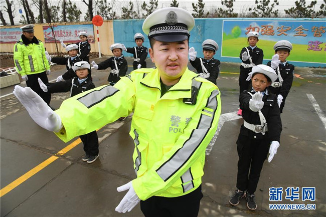 12月1日,東皋埠小學(xué)“小小交警隊”的隊員在學(xué)習(xí)交通指示手勢。新華社記者 李紫恒攝