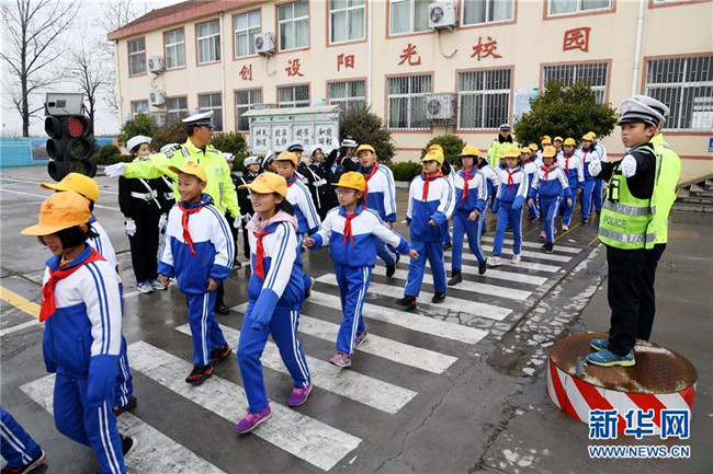 12月1日,東皋埠小學(xué)“小交警”在引導(dǎo)同學(xué)們安全通過“斑馬線”。新華社記者 李紫恒攝