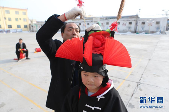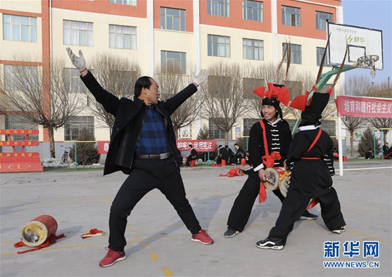 1月9日,在甘肅省武威市涼州區(qū)四壩鎮(zhèn)九年制學校,攻鼓子指導老師楊萬航(左)為學生示范動作。