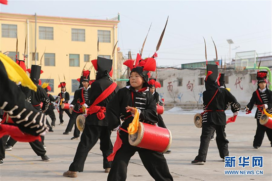 攻鼓子是發(fā)源于甘肅武威的一種民間鼓樂舞蹈,表演風格渾厚豪邁、威武雄壯,具有強烈的地域特色。2008年,涼州攻鼓子被列為第二批國家級非物質(zhì)文化遺產(chǎn)。為更好地傳承這項非物質(zhì)文化遺產(chǎn),甘肅省武威市涼州區(qū)四壩鎮(zhèn)九年制學校組建攻鼓子藝術(shù)社團,開設(shè)攻鼓子校本課,定期由當?shù)毓ス淖哟硇詡鞒腥藢W生進行指導,推動“非遺”攻鼓子藝術(shù)教育普及。 新華社記者 耿馨寧 攝