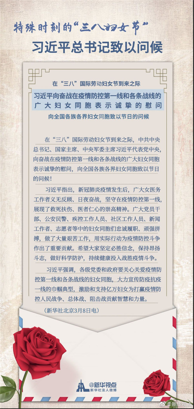 在“三八”國際勞動婦女節(jié)到來之際,中共中央總書記、國家主席、中央軍委主席習(xí)近平代表黨中央,向奮戰(zhàn)在疫情防控第一線和各條戰(zhàn)線的廣大婦女同胞表示誠摯的慰問,向全國各族各界婦女同胞致以節(jié)日的問候!