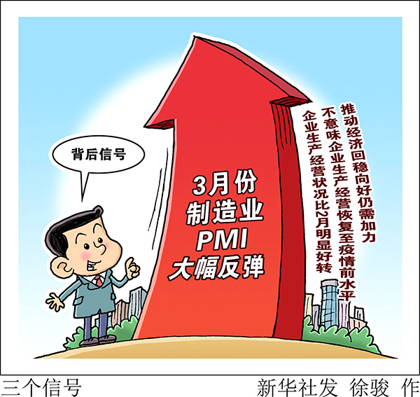 國(guó)家統(tǒng)計(jì)局服務(wù)業(yè)調(diào)查中心、中國(guó)物流與采購(gòu)聯(lián)合會(huì)31日發(fā)布數(shù)據(jù),3月份,中國(guó)制造業(yè)采購(gòu)經(jīng)理指數(shù)(PMI)為52%,比上月回升16.3個(gè)百分點(diǎn)。制造業(yè)PMI為何大幅反彈?回到榮枯線上方是否意味著經(jīng)濟(jì)企穩(wěn)?記者采訪了相關(guān)部門(mén)和專家。