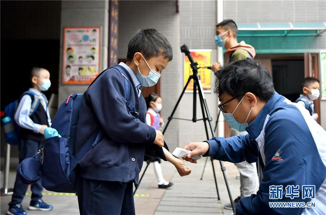 5月11日,陜西省西安市新城區(qū)后宰門小學(xué)的學(xué)生進校時測量體溫。新華社記者 劉瀟 攝