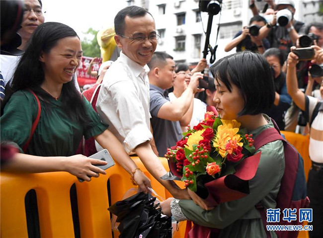 7月8日,一名考生(右)在湖南省長(zhǎng)沙市一中考點(diǎn)外從家長(zhǎng)手中接過(guò)鮮花。 當(dāng)日,全國(guó)部分地區(qū)2020年高考結(jié)束。 新華社記者 薛宇舸 攝