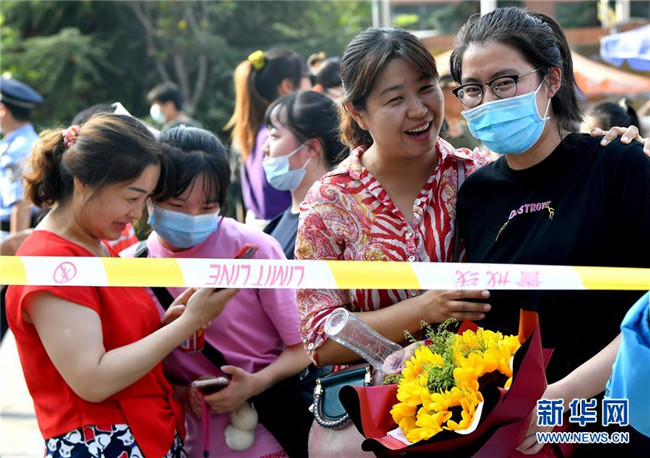 7月8日,吉林省長(zhǎng)春希望高中考點(diǎn)的考生接過(guò)家長(zhǎng)手中的花束。 當(dāng)日,全國(guó)部分地區(qū)2020年高考結(jié)束。 新華社記者 張楠 攝