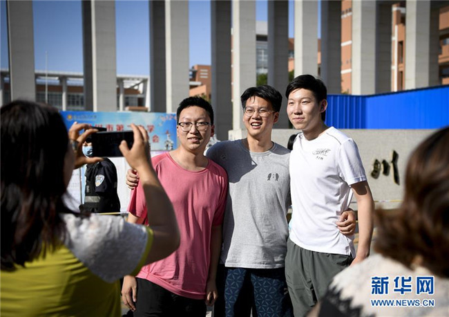 7月8日,在重慶市徐悲鴻中學(xué)考點(diǎn),考生在考試結(jié)束后在校門(mén)口合影。 當(dāng)日,全國(guó)部分地區(qū)2020年高考結(jié)束。 新華社記者 唐奕 攝