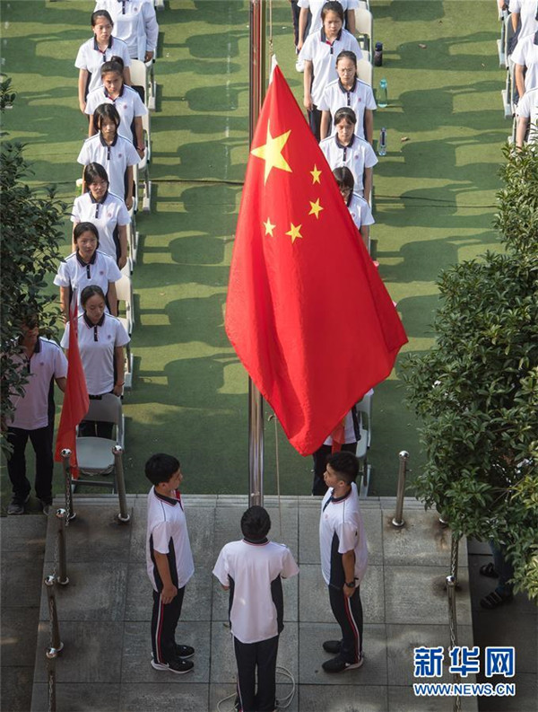 9月1日,武漢中學的開學典禮舉行升旗儀式。當日,武漢市2842所中小學、幼兒園迎來開學,涉及學生139.9萬人,百萬學子重返校園。新華社記者肖藝九攝