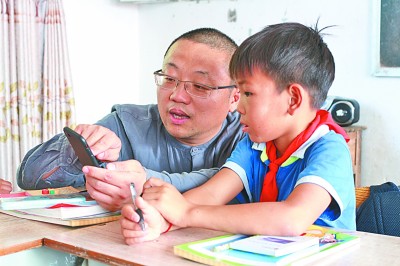 張海波(左)正在教學(xué)生合理使用手機。資料圖片