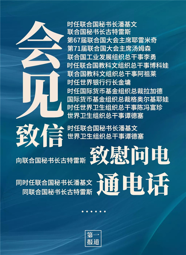2013年以來,習(xí)主席通過會見、通話、致信函等多種方式同聯(lián)合國主要官員保持密切溝通?;訉ο蟀?lián)合國秘書長、聯(lián)合國大會主席,還有聯(lián)合國工業(yè)發(fā)展組織、聯(lián)合國教科文組織、世界銀行、國際貨幣基金組織、世界衛(wèi)生組織等聯(lián)合國專門機構(gòu)主要負責(zé)人。