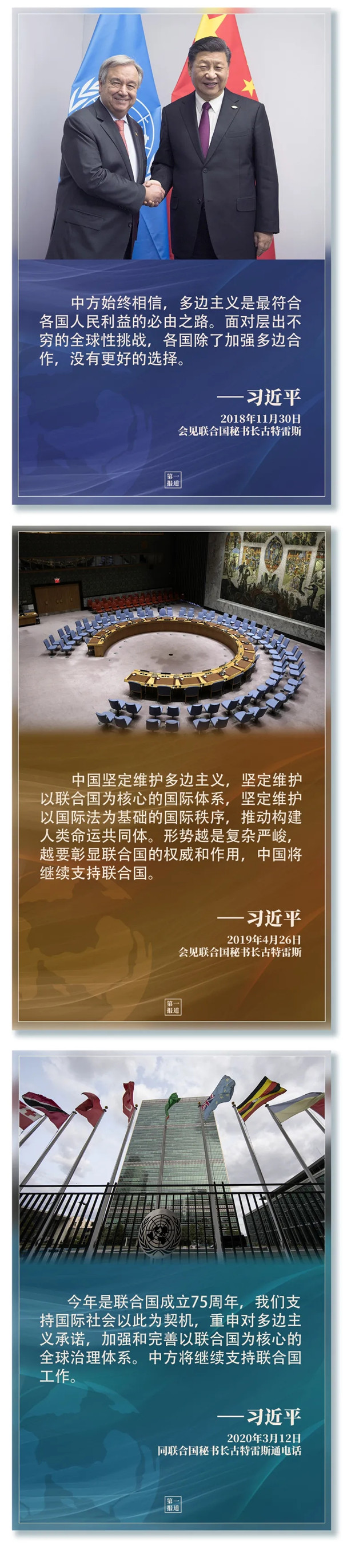 習(xí)主席指出,“支持聯(lián)合國發(fā)揮作用,維護聯(lián)合國權(quán)威和地位,是中國外交一項基本政策。”2013年以來,習(xí)主席多次會見聯(lián)合國主要官員,訪問聯(lián)合國總部及聯(lián)合國專門機構(gòu),出席一系列聯(lián)合國活動……親自推動中國同聯(lián)合國的合作,發(fā)出支持聯(lián)合國事業(yè)、捍衛(wèi)多邊主義的中國強音。