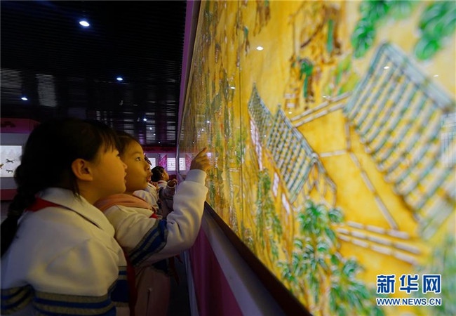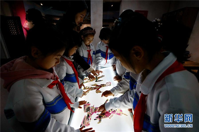 10月19日,小學(xué)生們在中國灤州皮影博物館內(nèi)參觀一幅皮影長卷。新華社記者 牟宇 攝