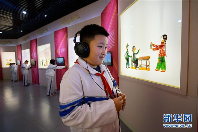 10月19日,小學(xué)生在中國灤州皮影博物館內(nèi)收聽皮影戲唱腔。新華社記者 牟宇 攝