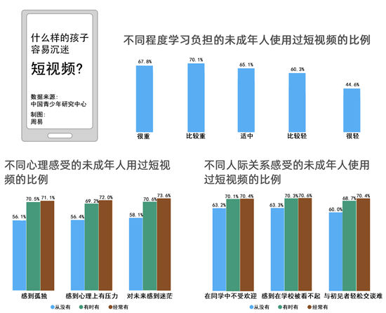 調查同時發(fā)現,感到孤獨、心理上有壓力、對未來迷惘的中小學生接觸短視頻的比例更高。