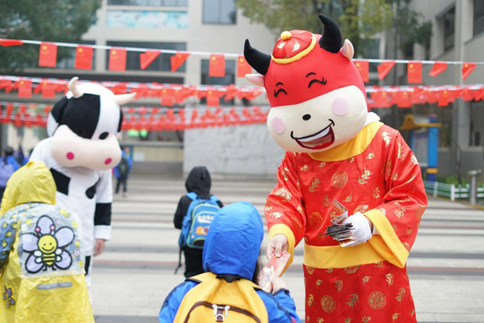 2月21日,南京市江寧開(kāi)發(fā)區(qū)學(xué)校一老師打扮成“福氣牛”,在校園門口為孩子們送上裝有口罩、新年祝福和防疫小貼士的“紅包”。邵丹 攝