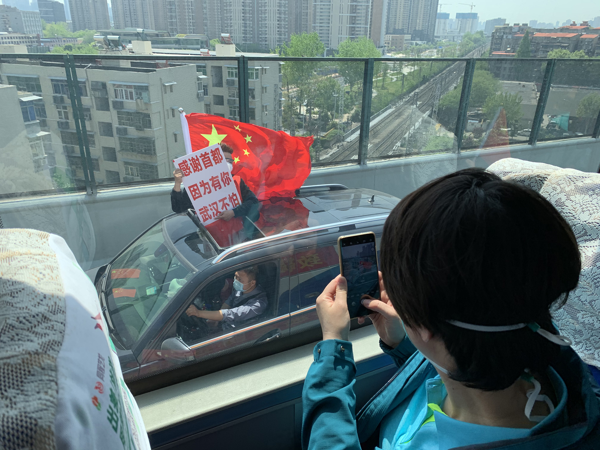 ↑2020年4月15日,武漢市民自發(fā)上街送別北京協(xié)和醫(yī)院國家援鄂抗疫醫(yī)療隊。