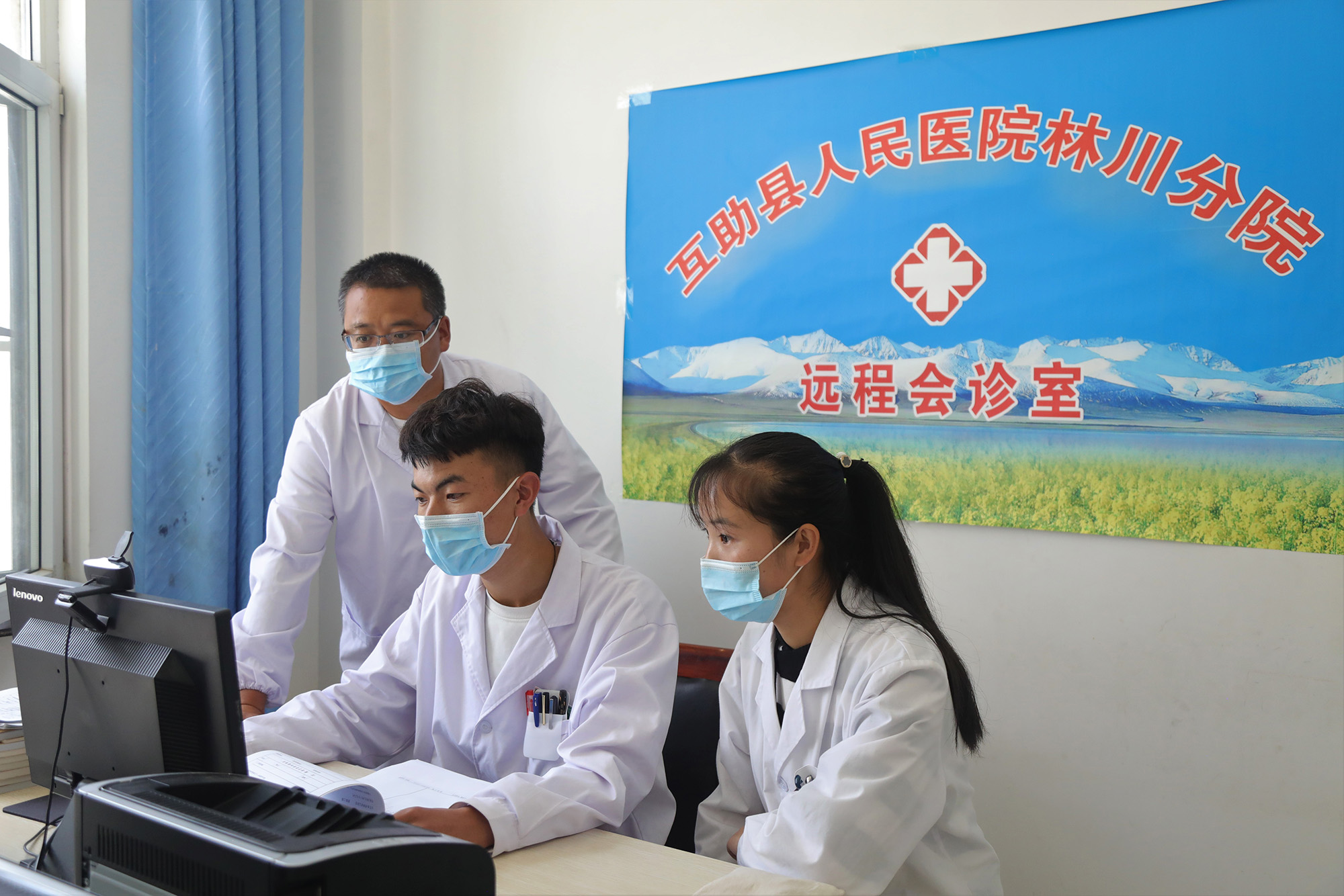 ↑在青海省海東市互助土族自治縣林川衛(wèi)生院遠程會診室,醫(yī)生盛生凱(左二)和同事在連線互助縣人民醫(yī)院專家(2020年9月10日攝)。
