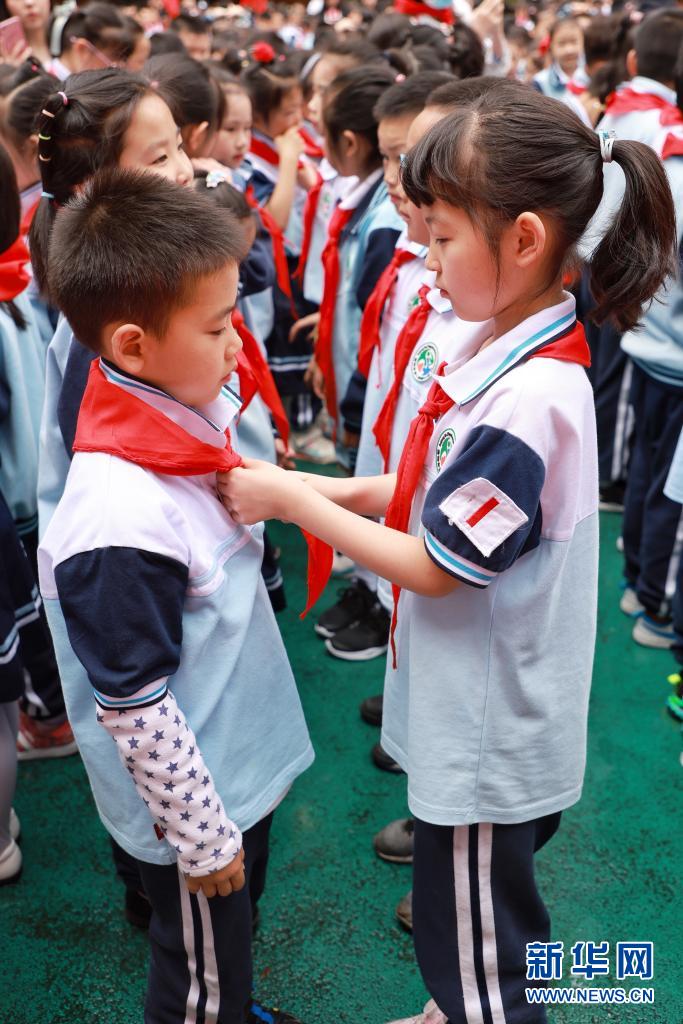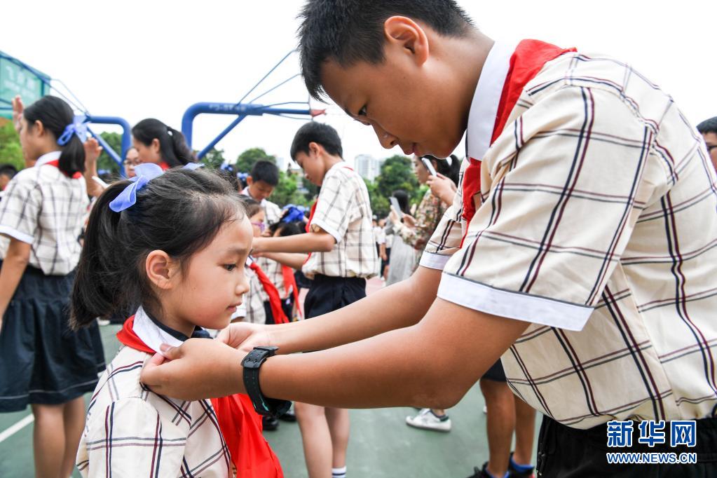 5月31日,高年級的少先隊員在入隊儀式上為新入隊的同學(xué)系紅領(lǐng)巾。新華社記者 劉續(xù) 攝