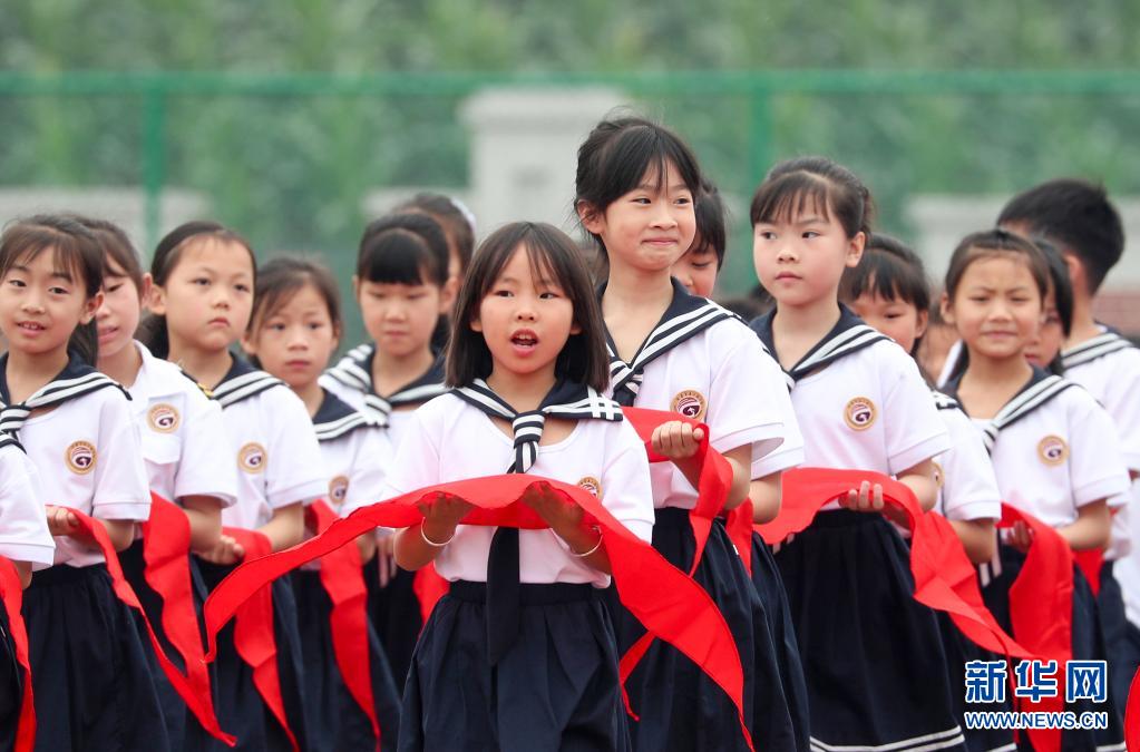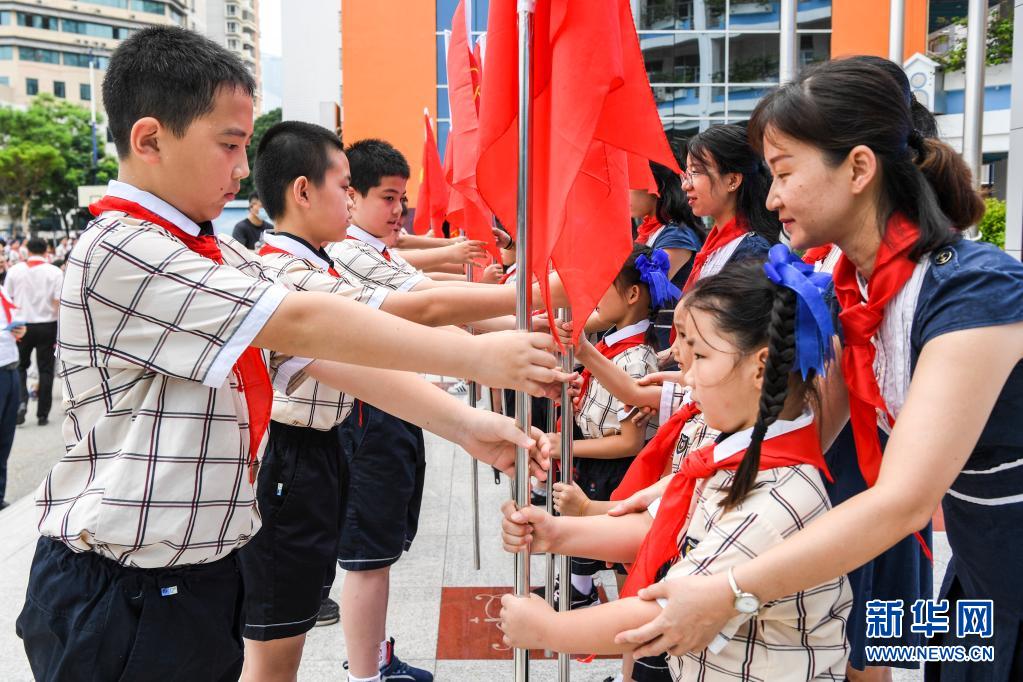 當(dāng)日,廣西南寧市濱湖路小學(xué)舉行“紅領(lǐng)巾心向黨 爭做新時代好隊員”為主題的少先隊員入隊儀式,一年級學(xué)生在“六一”前戴上紅領(lǐng)巾,光榮加入中國少年先鋒隊。