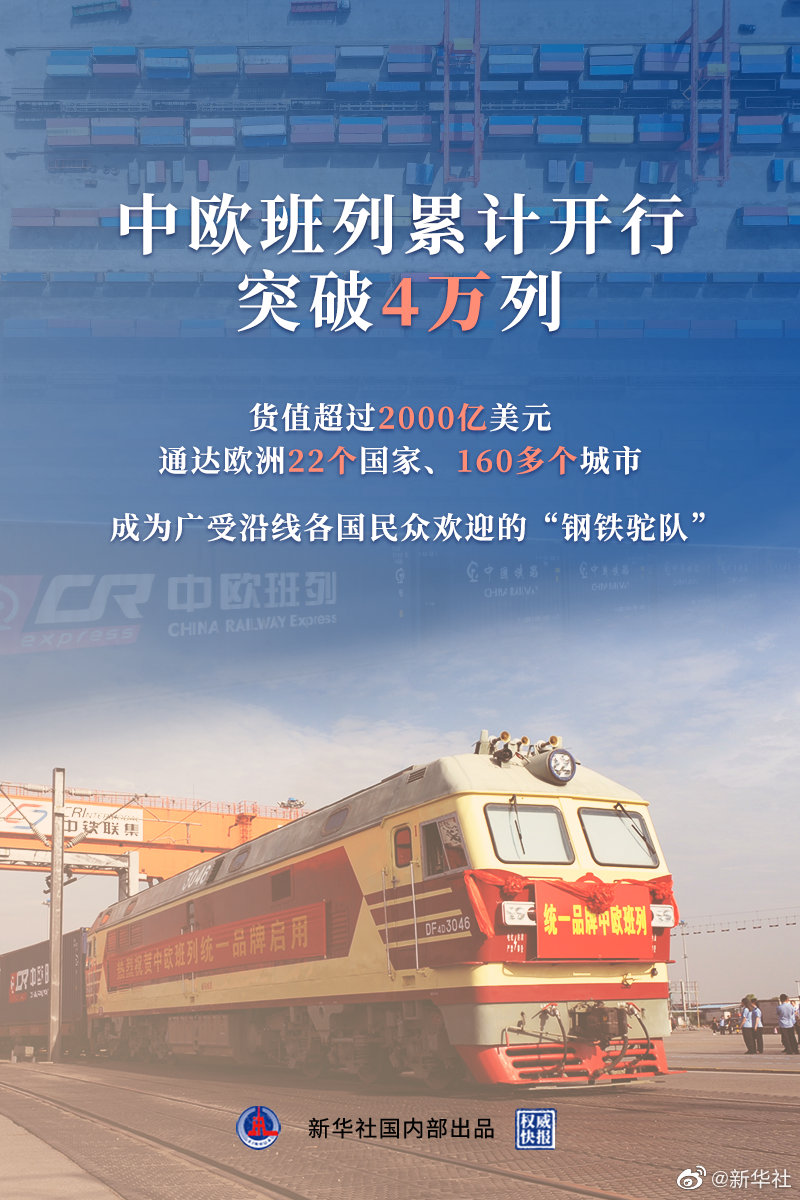 推進“一帶一路”建設(shè)工作領(lǐng)導(dǎo)小組辦公室20日召開中歐班列統(tǒng)一品牌五周年工作座談會。截至目前,中歐班列累計開行突破4萬列,合計貨值超過2000億美元,打通了73條運行線路,通達(dá)歐洲22個國家160多個城市。新冠肺炎疫情發(fā)生以來,中歐班列累計向歐洲發(fā)運1199萬件防疫物資。2011年3月,首趟中歐班列從重慶發(fā)出開往德國杜伊斯堡,開啟中歐班列創(chuàng)新發(fā)展的序章。2016年6月20日,統(tǒng)一品牌中歐班列首達(dá)歐洲(波蘭)儀式在波蘭華沙舉行。(記者安蓓,海報設(shè)計楊軼群)