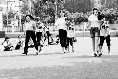 河北省邯鄲市廣平縣濱河小學教師們和學生一起在趣味運動活動中參加“二人三足跑”項目。程學虎攝/光明圖片