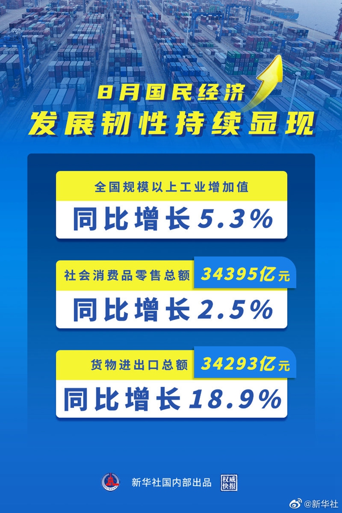 國家統(tǒng)計局15日發(fā)布的數(shù)據(jù)顯示,8月份,全國規(guī)模以上工業(yè)增加值同比增長5.3%,兩年平均增長5.4%;社會消費品零售總額34395億元,同比增長2.5%,兩年平均增長1.5%;貨物進出口總額34293億元,同比增長18.9%,國民經濟發(fā)展韌性持續(xù)顯現(xiàn)。(記者魏玉坤、謝?,帲?/p>