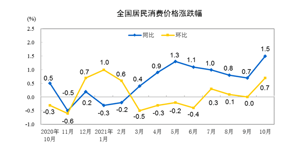 國家統(tǒng)計局10日發(fā)布數(shù)據(jù),10月份,全國居民消費價格指數(shù)(CPI)同比上漲1.5%,漲幅雖比上月擴大0.8個百分點,但仍低于宏觀調(diào)控預期目標,消費市場供需基本平穩(wěn)。