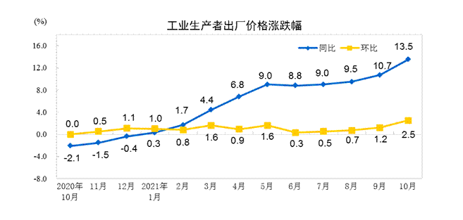 專家分析,部分食品和工業(yè)消費品價格漲幅擴大,顯示大宗商品價格上漲壓力正向部分終端消費品傳導。據(jù)統(tǒng)計,受國際輸入性因素疊加國內(nèi)主要能源和原材料供應偏緊影響,10月份,全國工業(yè)生產(chǎn)者出廠價格指數(shù)(PPI)同比上漲13.5%,漲幅比上月擴大2.8個百分點。