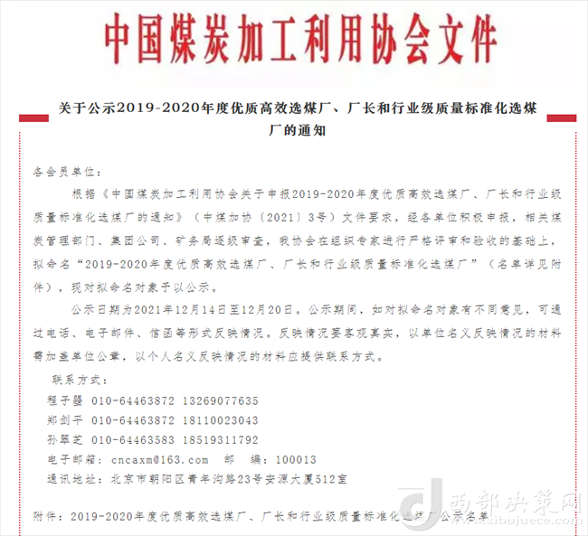 西部決策網(wǎng)訊12月14日,從中國煤炭加工利用協(xié)會傳來喜訊,陜煤集團陜北礦業(yè)檸條塔公司選煤廠榮獲2019-2020年度行業(yè)級質量標準化選煤廠。
