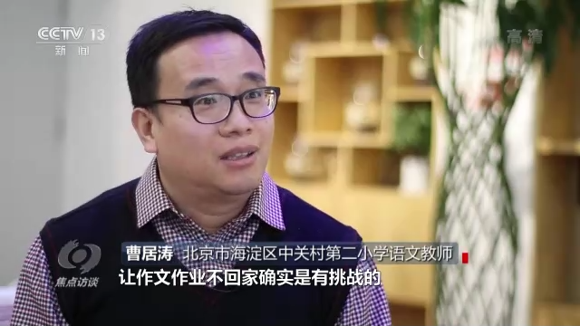 北京市海淀區(qū)中關(guān)村第二小學(xué)語文教師曹居濤說:“比如說高年級的作文,讓作文作業(yè)不回家確實是有挑戰(zhàn)的,所以我們就對教與學(xué)的方式進行了大膽的嘗試和改變。從習(xí)作布置的時間上進行了改變,叫任務(wù)前置。孩子學(xué)習(xí)單元之初,要了解這一單元當(dāng)中的習(xí)作主題是什么,讓孩子的習(xí)作和生活建立聯(lián)系。”