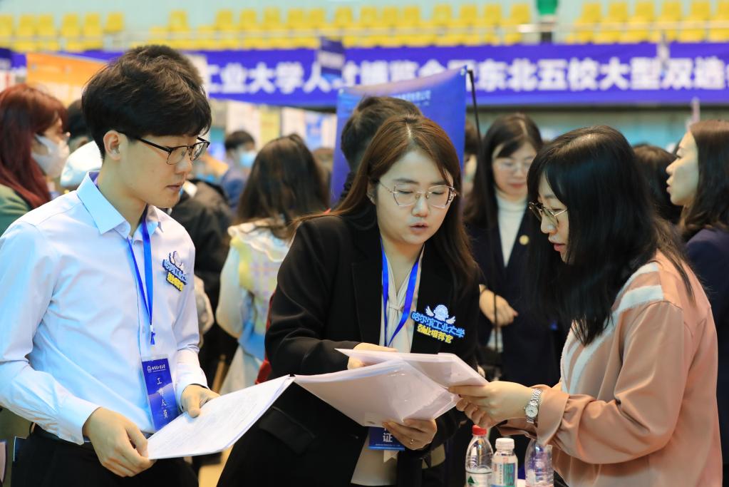 哈工大“就業(yè)推薦官”(中)向企業(yè)招聘負責人現(xiàn)場推薦畢業(yè)生。